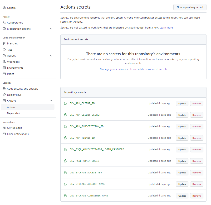 For the purpose of this example, the dev environment will require the following secrets configured as they are referenced in the workflows and terraform code: