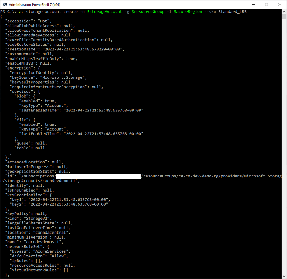az storage account create -n $storageAccount -g $resourceGroup -l $azureRegion –sku Standard_LRS