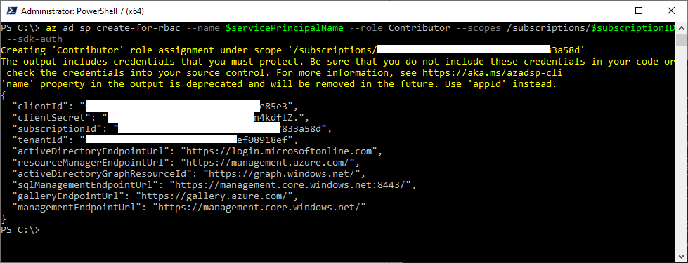 az ad sp create-for-rbac –name $servicePrincipalName –role Contributor –scopes /subscriptions/$subscriptionID –sdk-auth