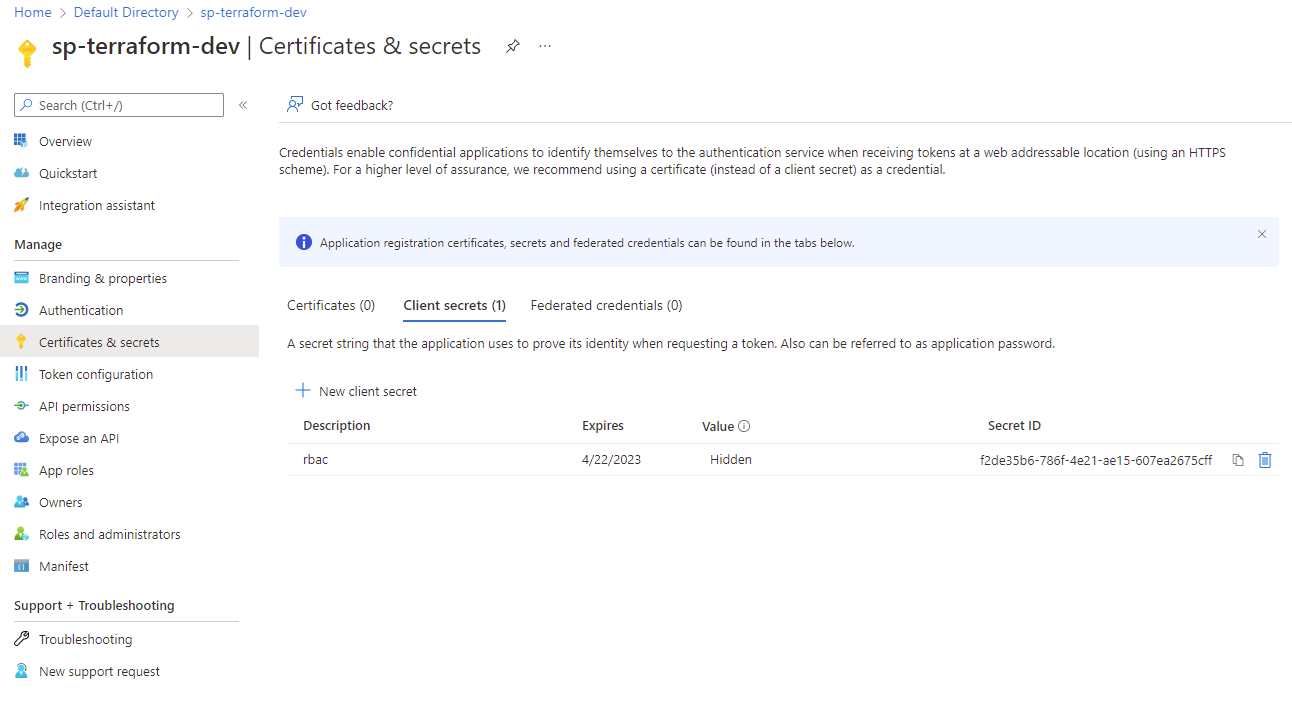 Copy the clientId, clientSecret, tenantId values.