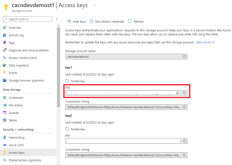 Proceed to navigate to the previously configured Storage Account’s Access Keys and copy the key1 as we’ll need to configure it in GitHub secrets:
