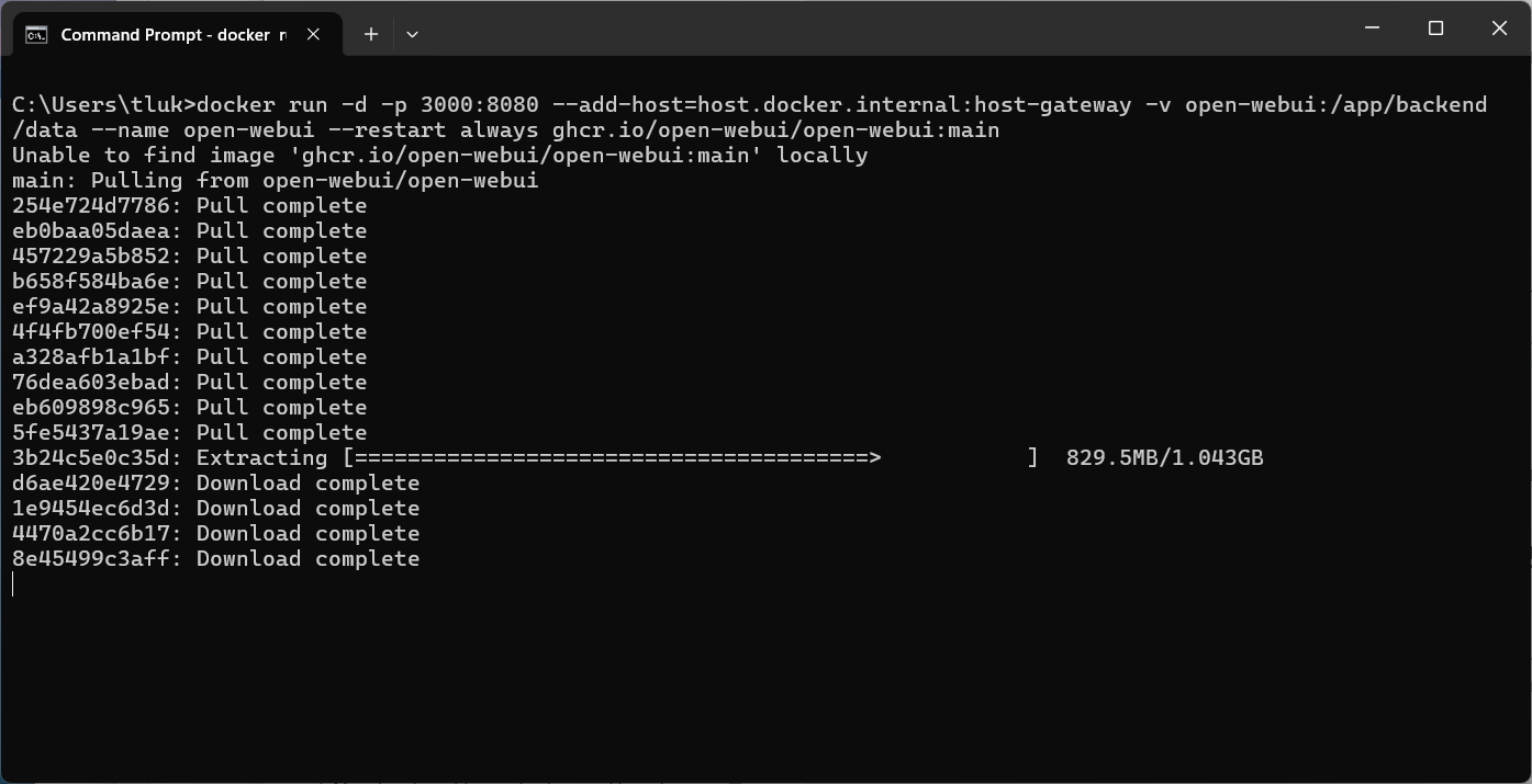docker run -d -p 3000:8080 –add-host=host.docker.internal:host-gateway -v open-webui:/app/backend/data –name open-webui –restart always ghcr.io/open-webui/open-webui:main