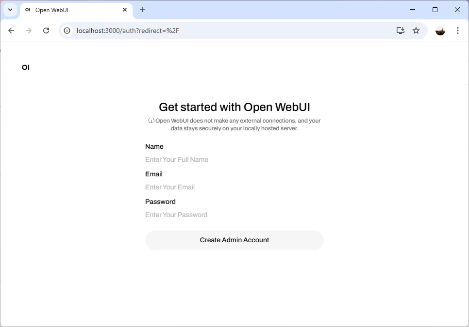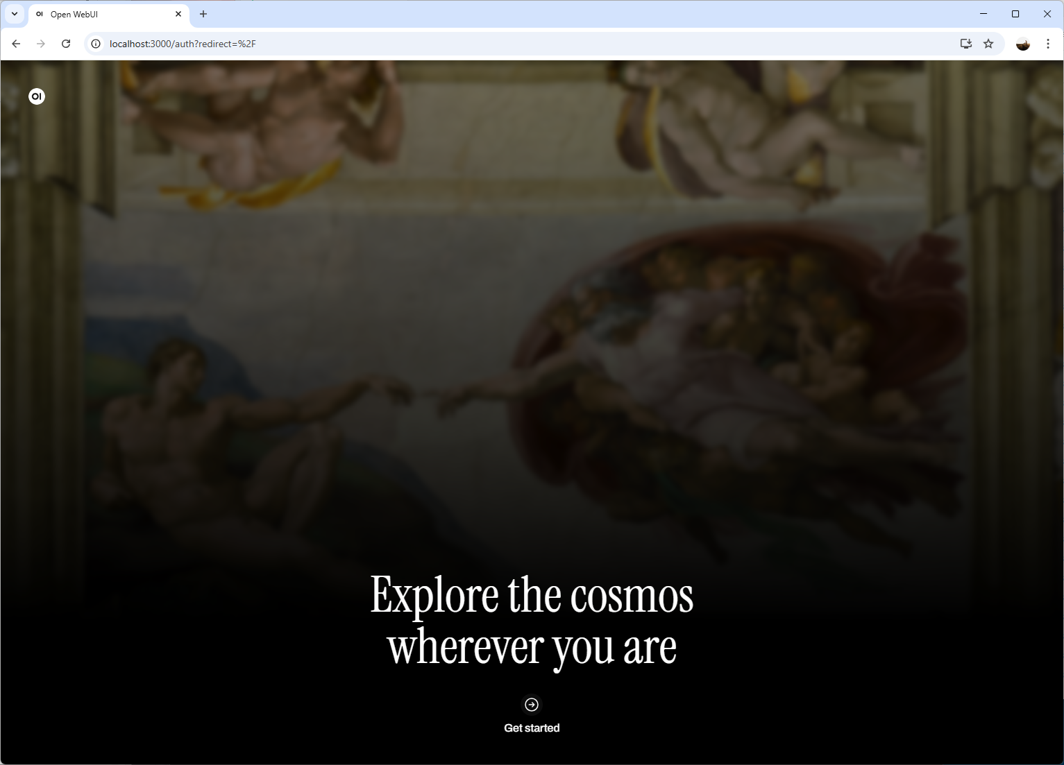 Navigate to https://localhost:3000 and you should see the welcome screen for Open WebUI: