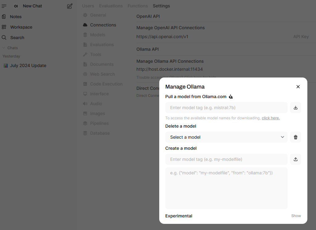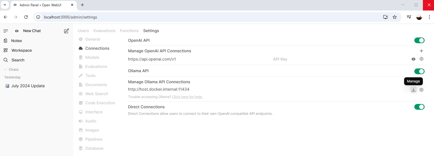 Open WebUI provides an easy way to pull new models directly from Ollama (rather than the console as we did in my previous post) via the GUI so proceed to the Connections menu and click on the Manage button (looks like a download icon) beside Manage Ollama API Connections: