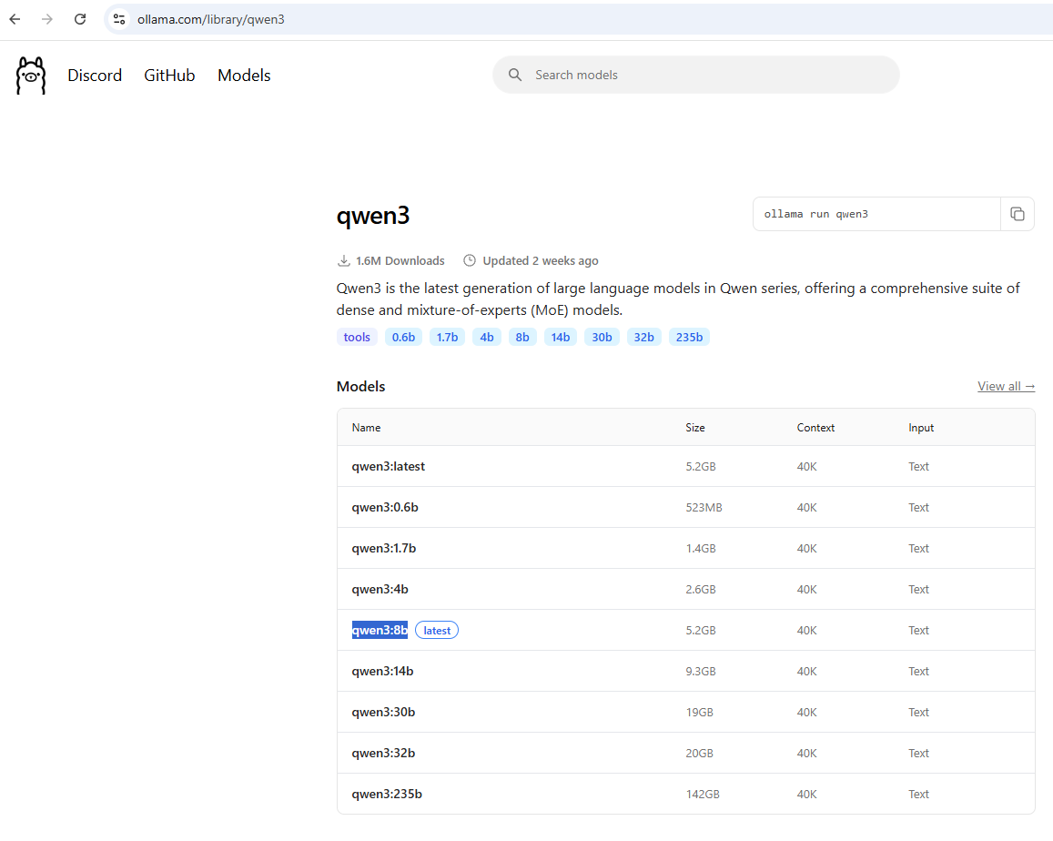 Let’s try installing qwen3 for the purpose of this example. Click into the model’s link and copy the name of the desired release: