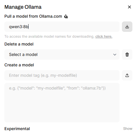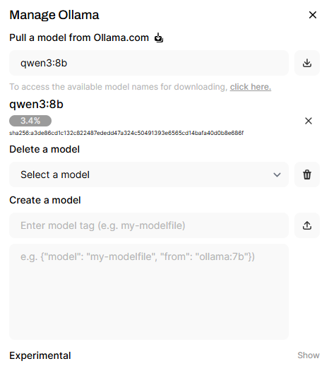 Paste it into the Pull a model from Ollama.com and hit the button next to the text field to start the download: