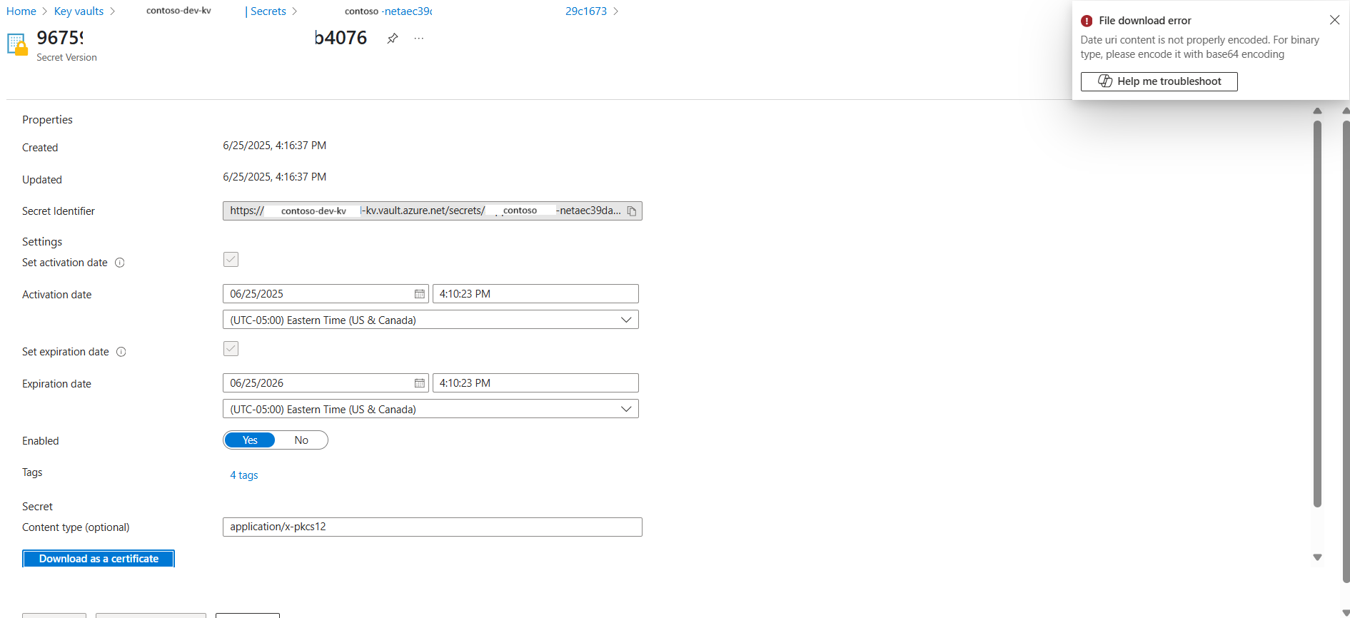 Another common issue I come across is when I attempt to download a certificate imported into a Key Vault from an App Service Certificate. What you’ll notice with such an import is that it is not placed into the Certificates blade, rather, it is placed into Secrets with the Type as application/x-pkcs12:
