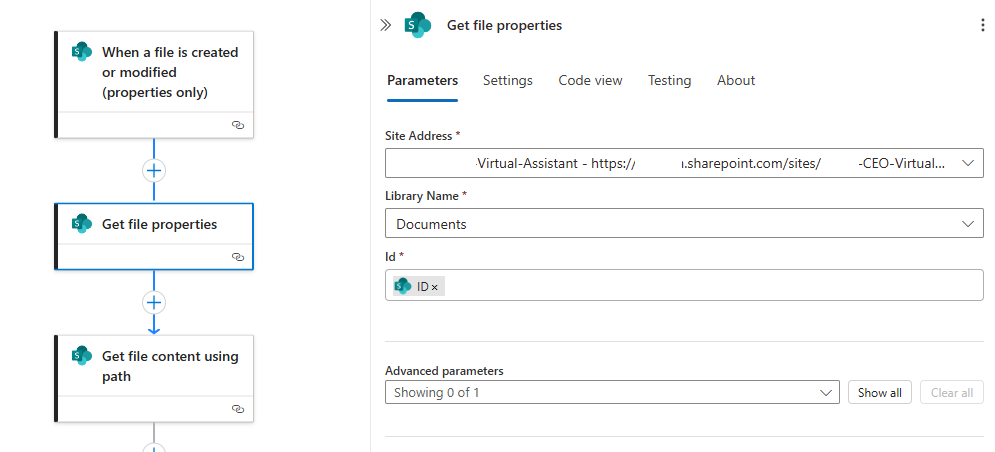 Add the action Get file properties and configure the properties of the SharePoint site’s document library, then specify the ID of the previous When a file is created or modified (properties only) as the value: