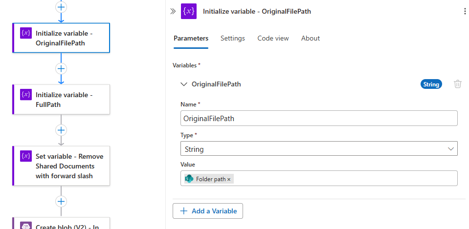 Let’s now initialize some variables we’ll need for the processing. Create a new Initialize variable – OriginalFilePath and configure as such: