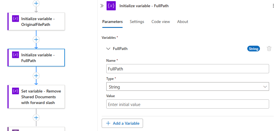 Create a new Initialize variable – FullPath and configure as such: