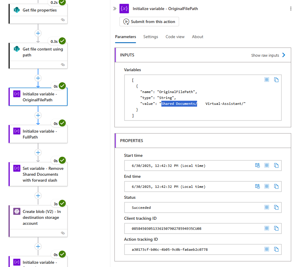 Now that we’ve extracted and created the variables and data we need, proceed to add the action Create blob (V2) – In destination storage account to copy the file to the Storage Account where we will be indexing the file with AI Search:
