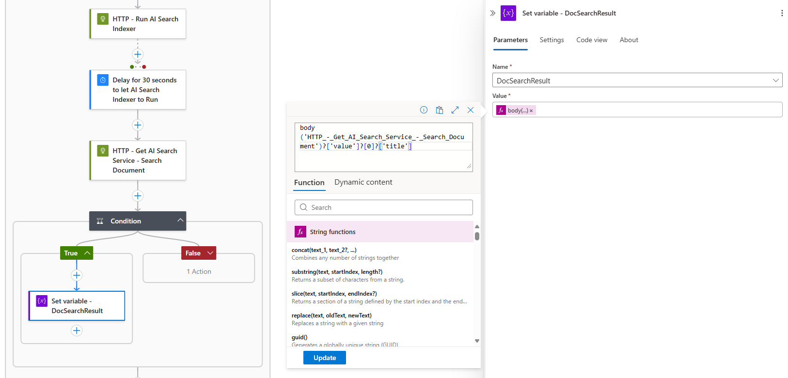30 seconds delay after, the action HTTP – Get AI Search Service – Search Document will attempt to find the document: