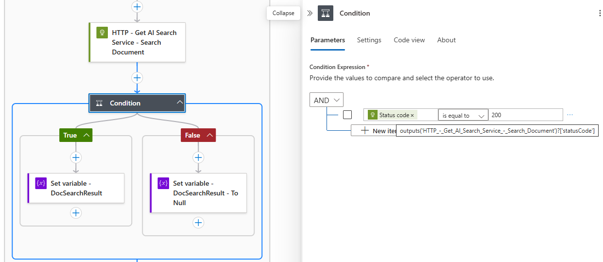 The next condition will now check to validate that the previous HTTP action has returned a Status Code of 200: