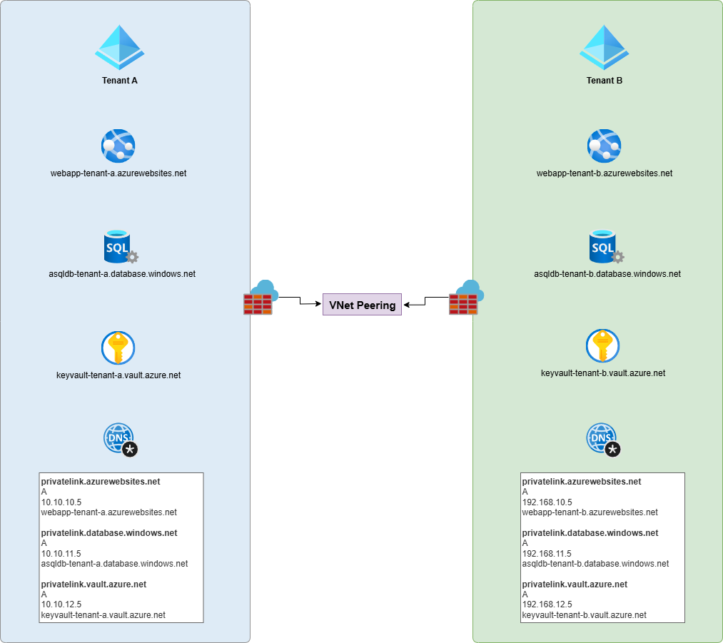If the resources in either tenant need to resolve the other tenant’s resource private IPs, they would not be able to because each tenant has its own Private DNS Zone for the privatelink zones. If the two tenants belong to the same organization and there are no security concerns in sharing a single Private DNS Zone, then a possibility is to centralize the DNS zones into a single Private DNS Zone hosted in, say, a hub network, then link the Virtual Networks to it for both tenants. This isn’t always feasible if the two tenants belong to different organizations.