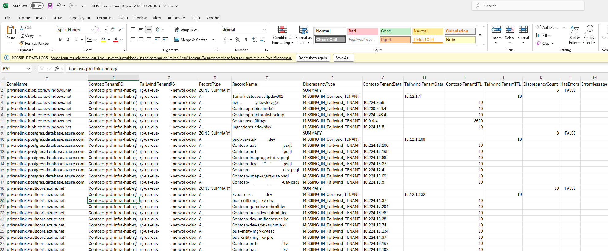 For the purpose of this blog post, let’s say the only solution is the more painful approach and that is to ensure the corresponding tenant’s DNS records of private IP addresses are added to the other tenant’s private DNS zones. It’s manual and increases administration effort but I’ve come across such scenarios and the way I’ve tried to make it less painful is use a script to generate a DNS report that highlights the missing DNS records for both private DNS zones.