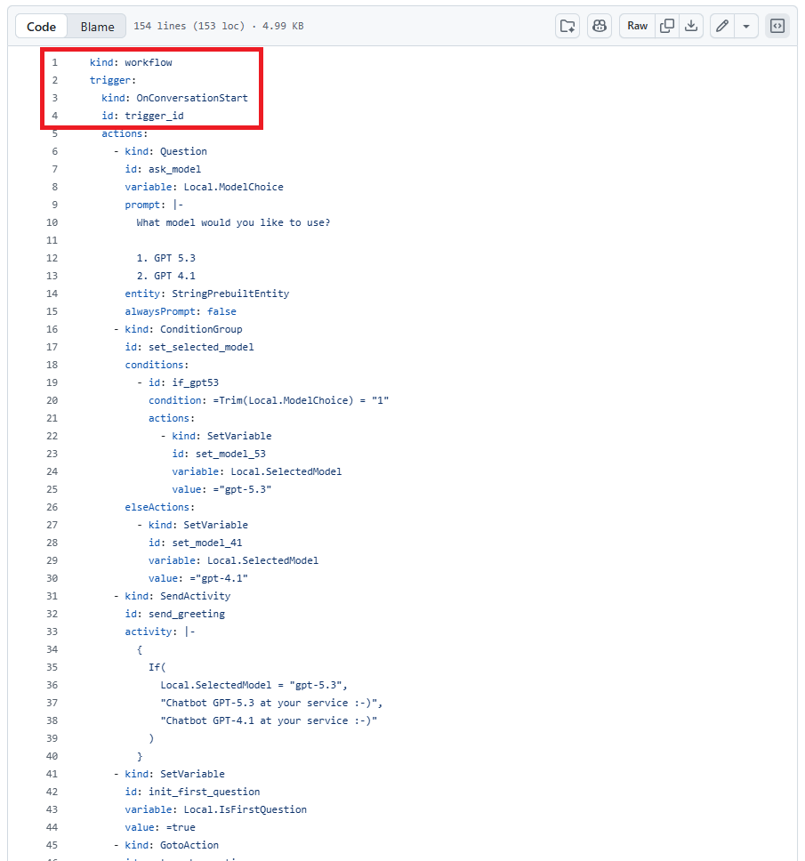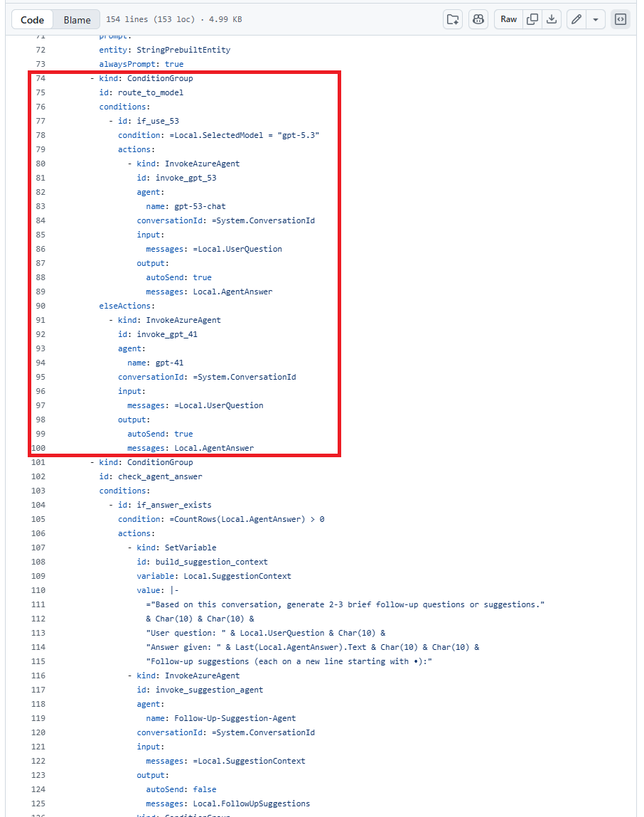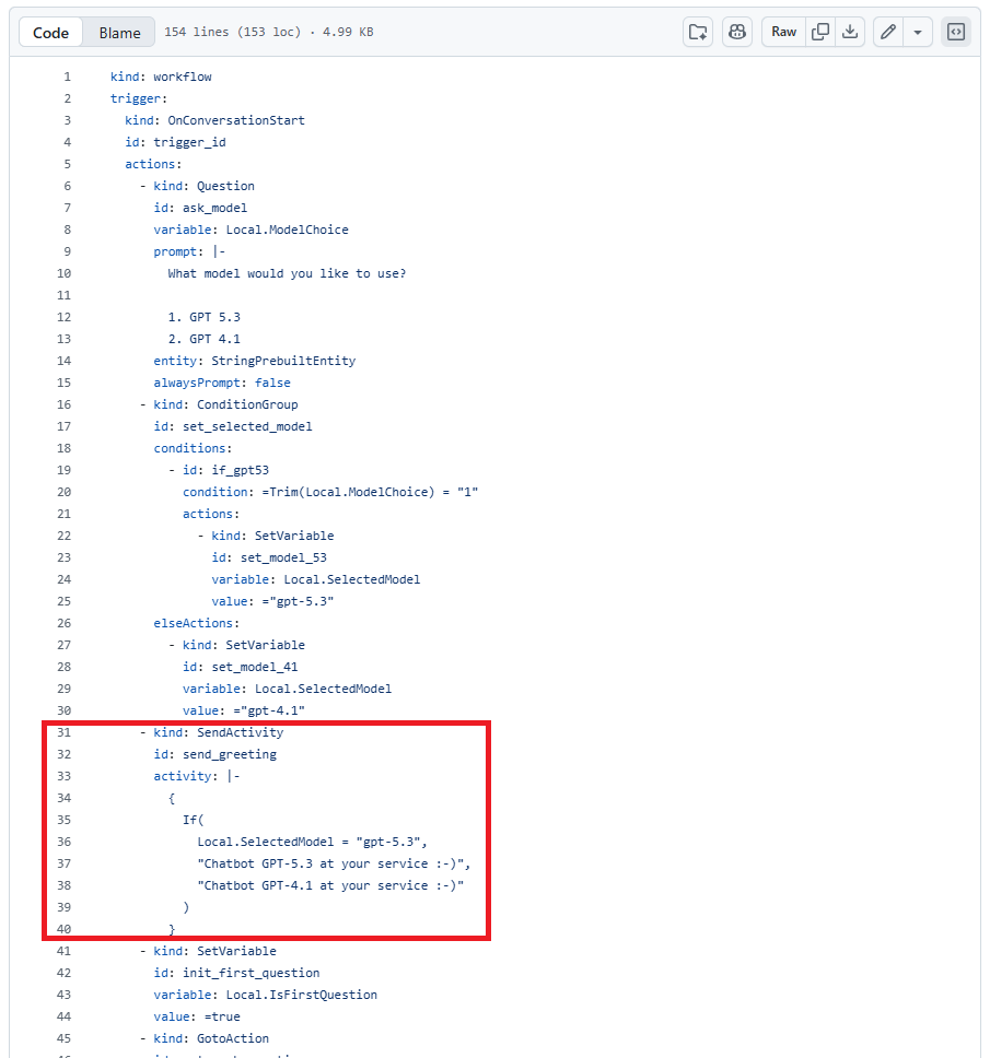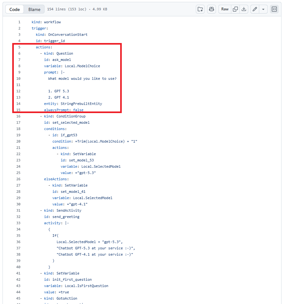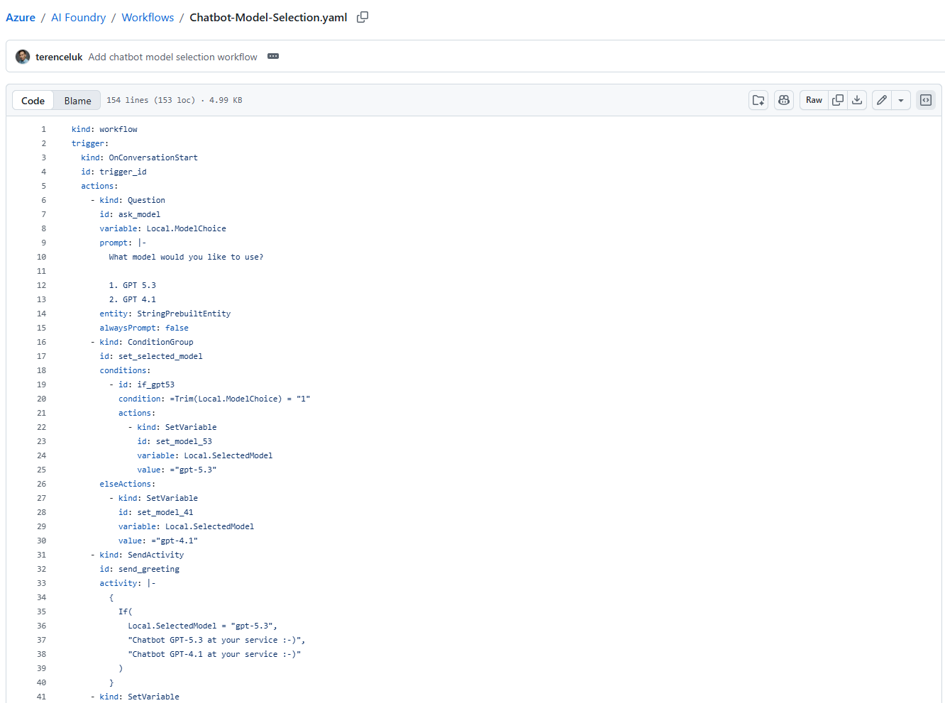 Let’s start by looking at the full workflow configuration here in my GitHub repo: https://github.com/terenceluk/Azure/blob/main/AI%20Foundry/Workflows/Chatbot-Model-Selection.yaml
