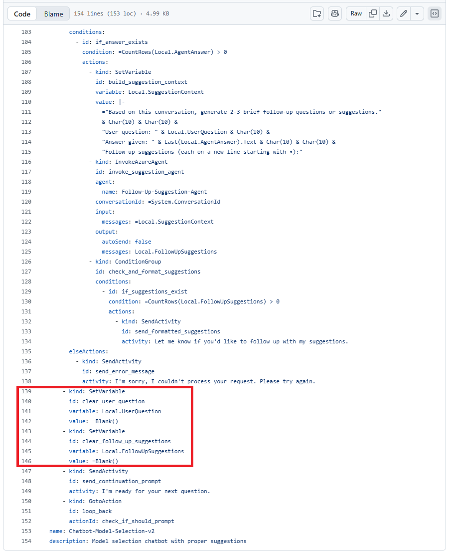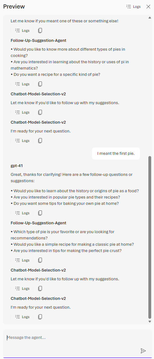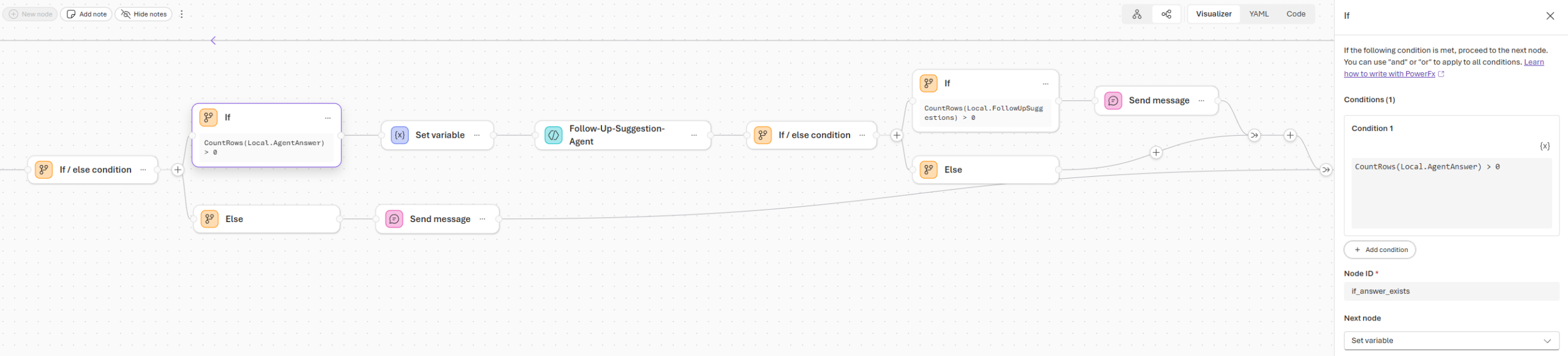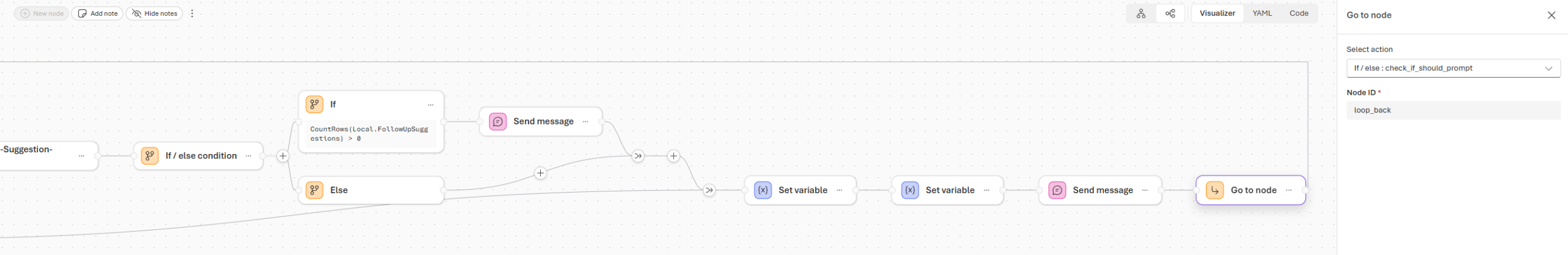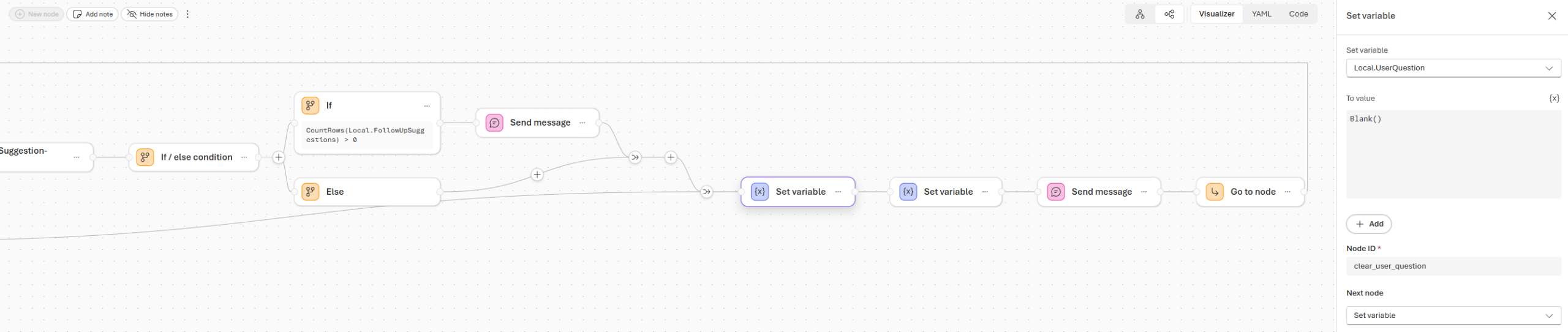 The desired interaction with the user has now now completed and before reiterating the loop, we’ll need to clean up the variables with the Power FX Blank() before returning to the start. We want to clear the Local.UserQuestions value to prevent scenarios where the next run’s agent fails to process the question and answer, then enters the next loop with stale data that was never processed: