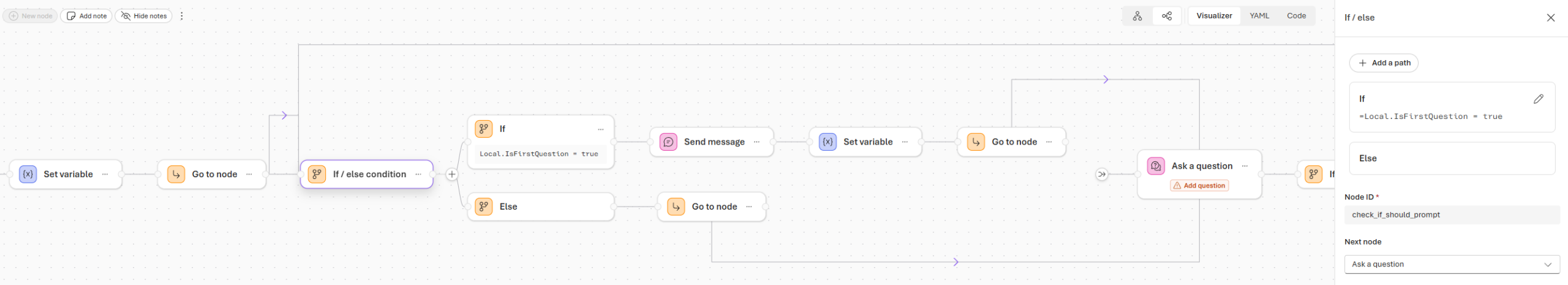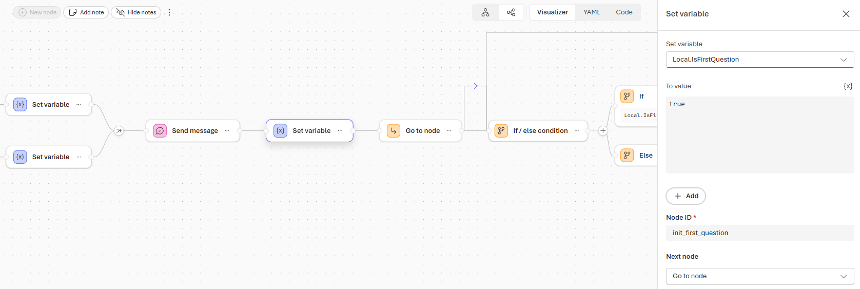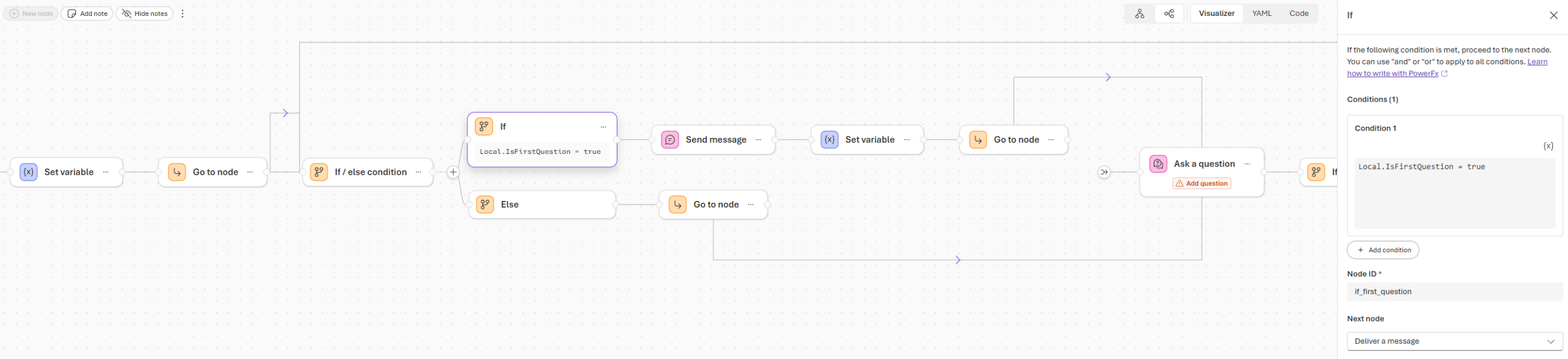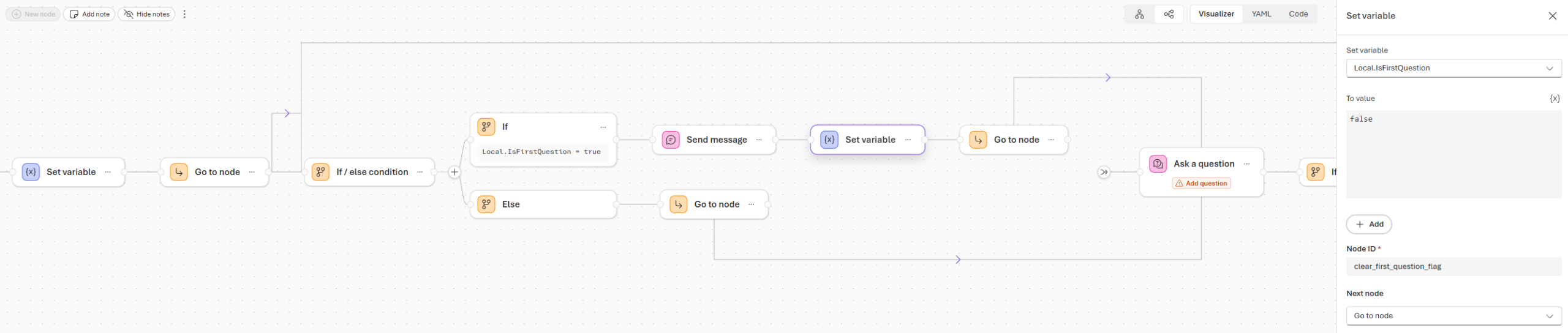 The desired interaction with the user has now now completed and before reiterating the loop, we’ll need to clean up the variables with the Power FX Blank() before returning to the start. We want to clear the Local.UserQuestions value to prevent scenarios where the next run’s agent fails to process the question and answer, then enters the next loop with stale data that was never processed: