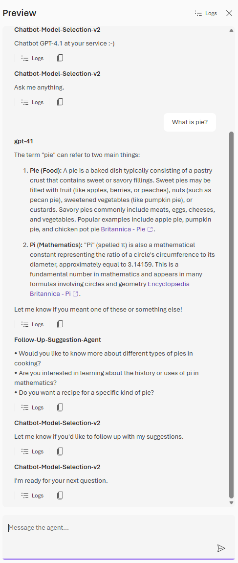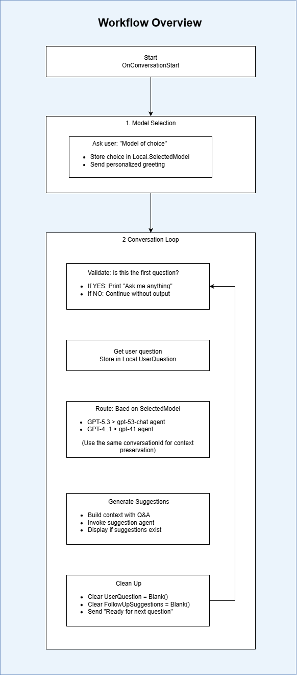 I’ve been meaning to spend some more time to create a multi agent workflow in AI Foundry that showcased the capabilities as well as demonstrate a flow that did not have to be a simple start to finish design. My first attempt, which I haven’t gotten back to, was allowing a user to leverage an MCP server provided by a Logic App but that workflow sort of got held up by my inability to determine how to remove the approval requirement for when the agent called on the tool (I still need to get to that). What I ended up deciding on over an evening was to try and create a workflow that allowed a user to select an LLM model amongst the options available, receive an answer to their question, receive suggestions on what they could ask in relation to their question. Those who are familiar with CoPilot will recognize the recommendations effectively mimics what M365 CoPilot does. To itemize the process, this workflow will: