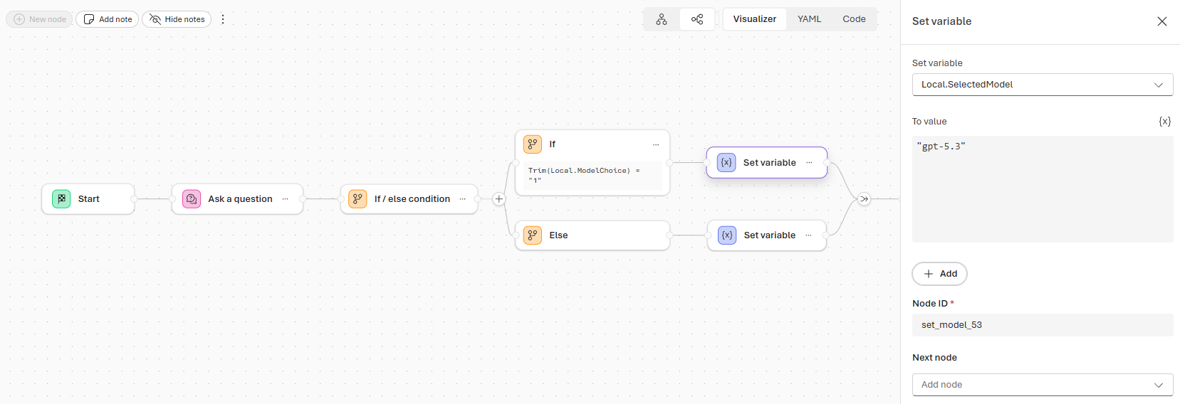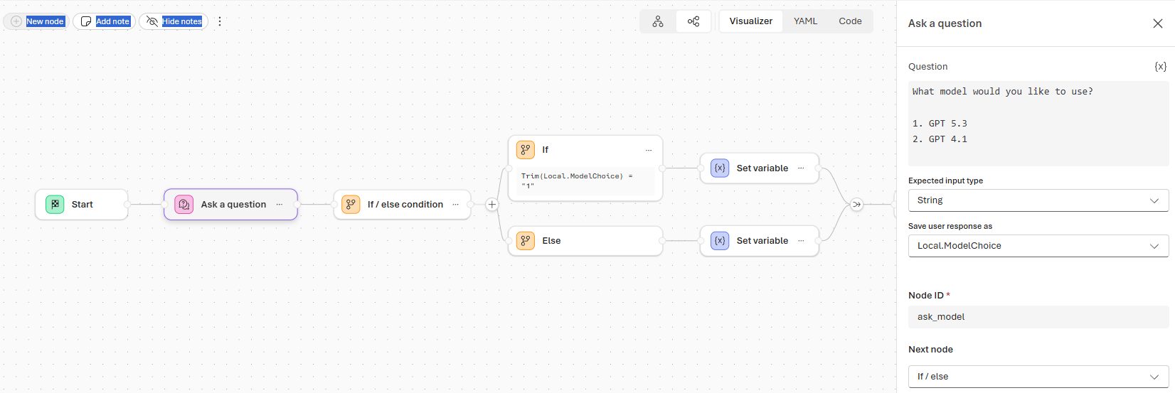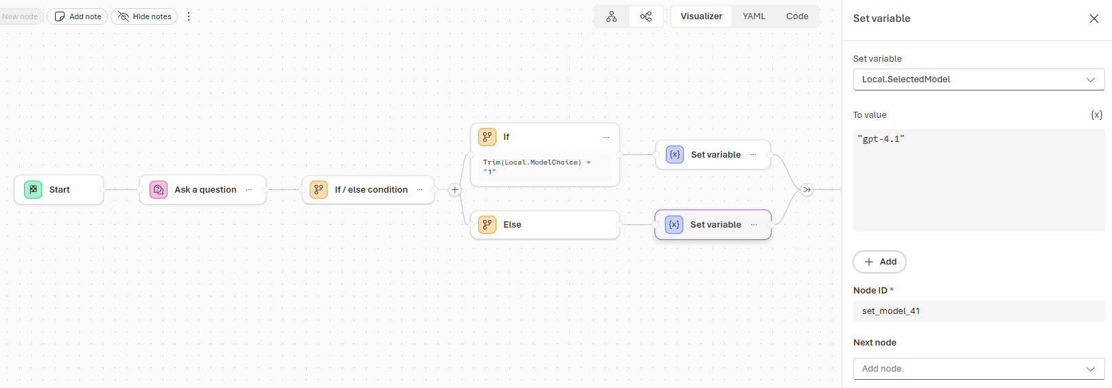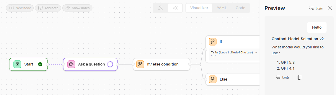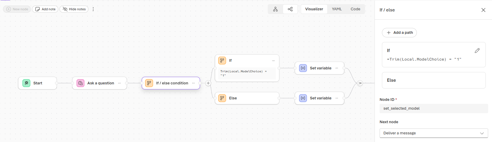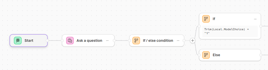 The Trim() function handles any accidental spaces in the user’s input, which will then be stored in the Local.SelectedModel variable that persists for the entire conversation.