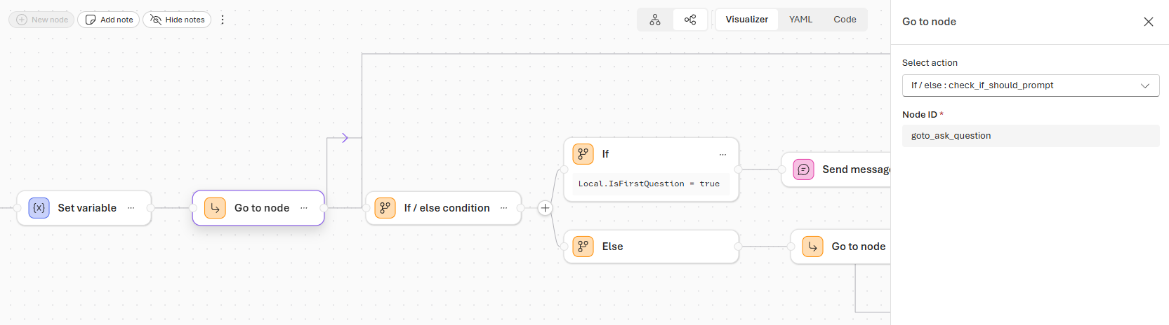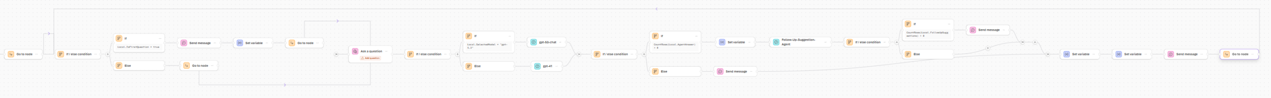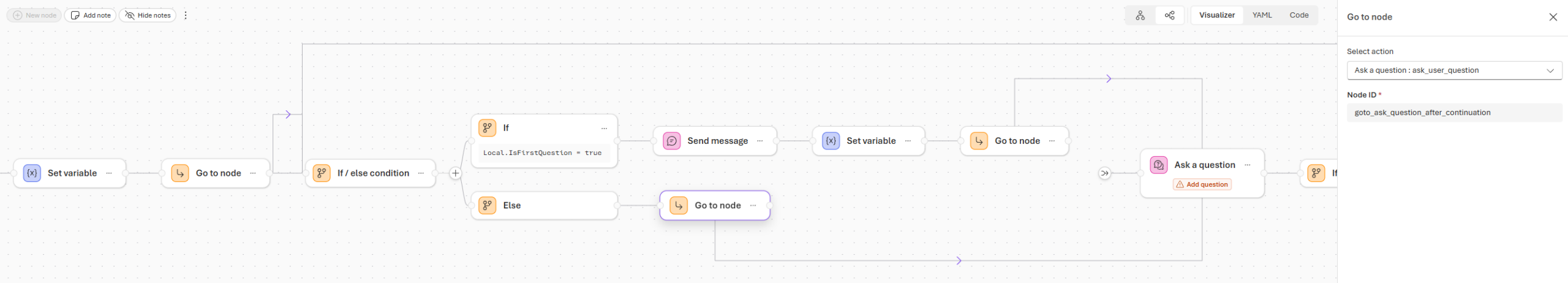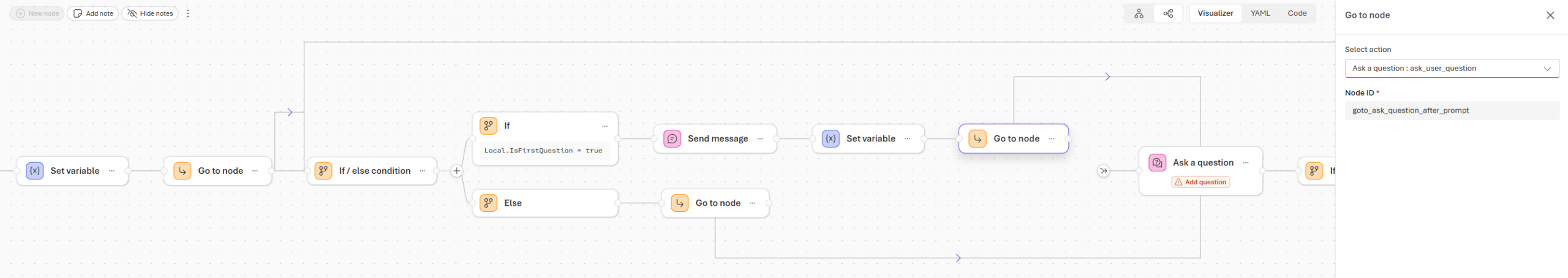 The workflow now uses GotoAction to jump to the main conversation handler: