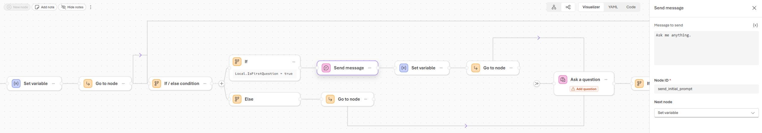 We’ll be storing the value true to indicate that this is the first question from the user so the message: “Ask me anything.” can be sent: