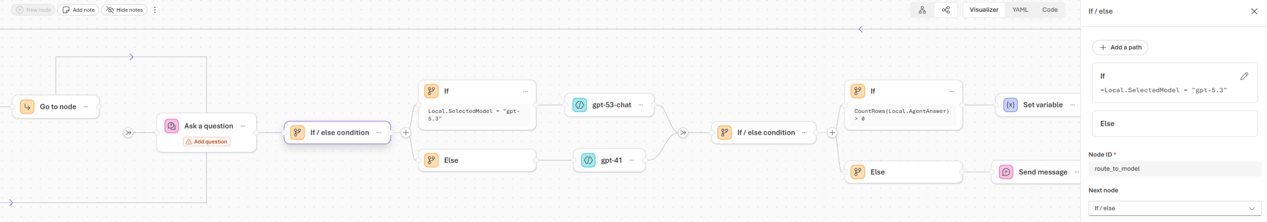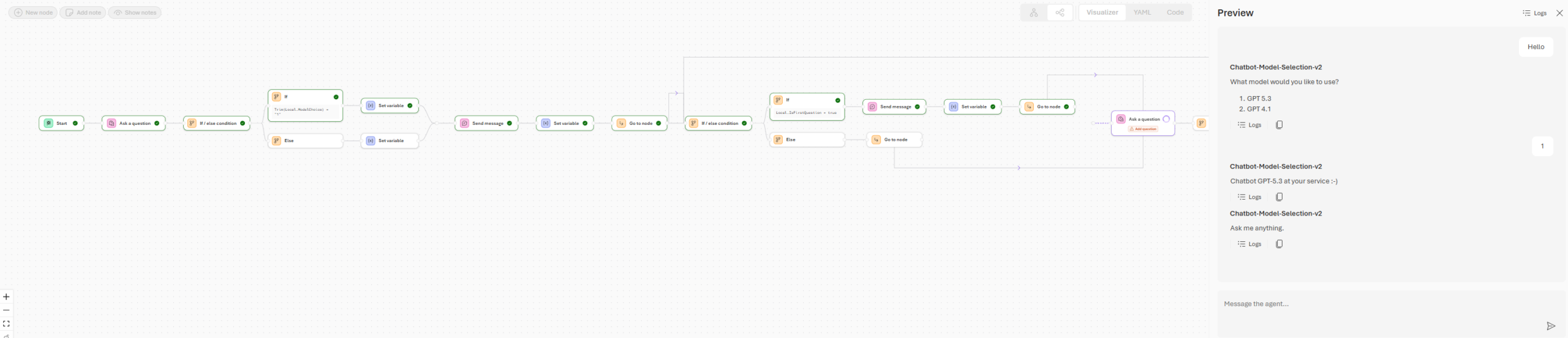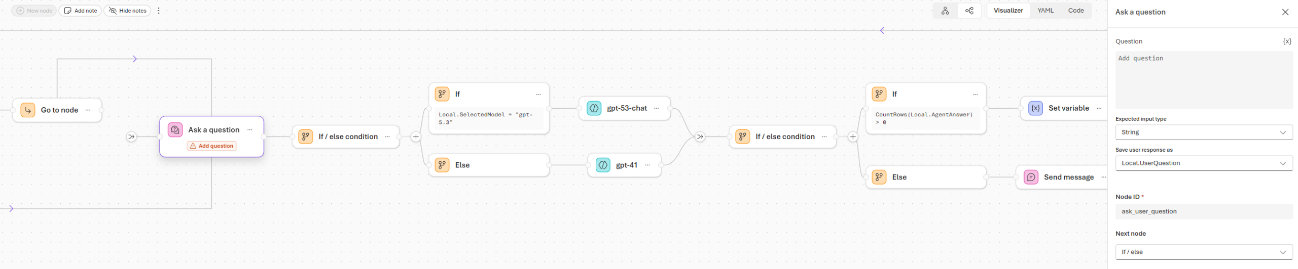 2. Conversation Loop: The workflow continuously accepts questions and routes them to the selected model