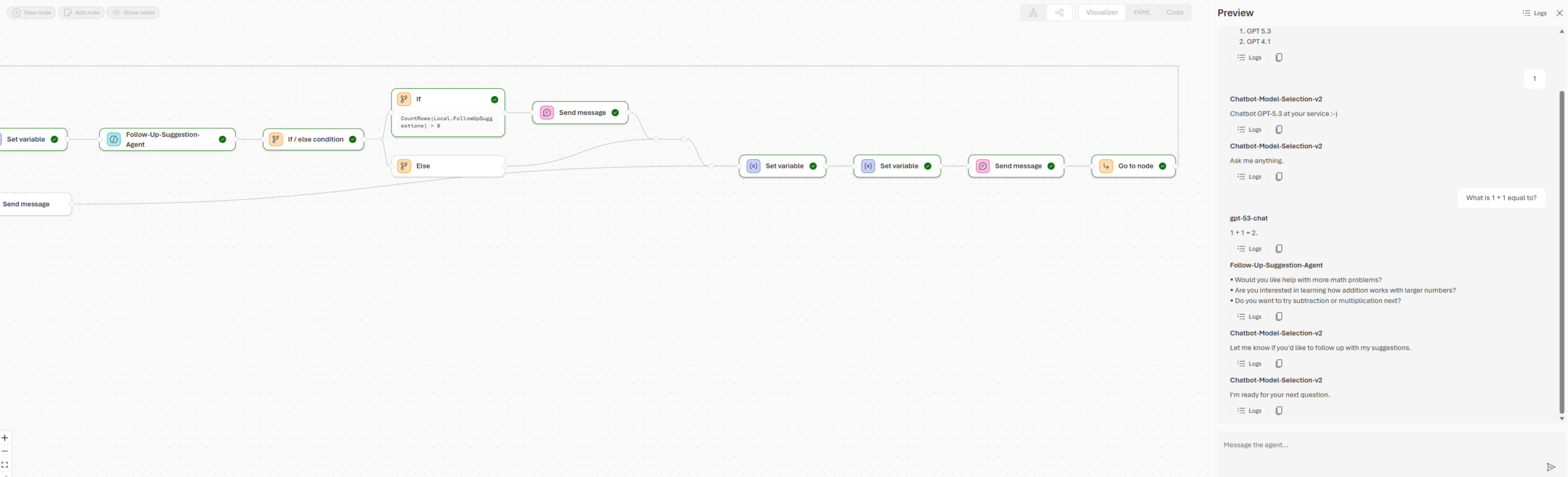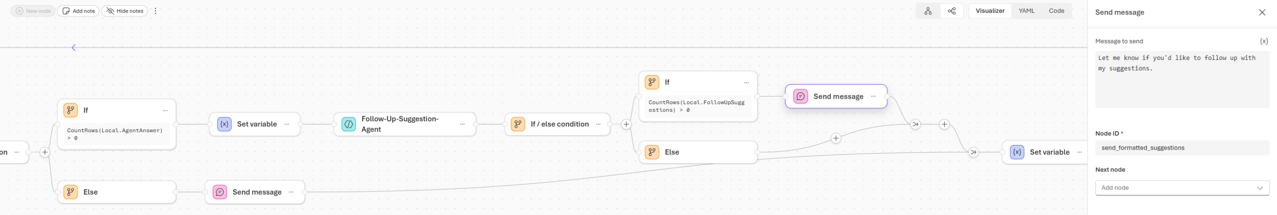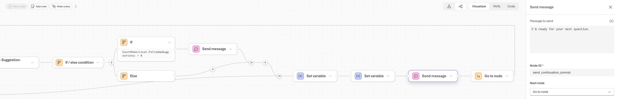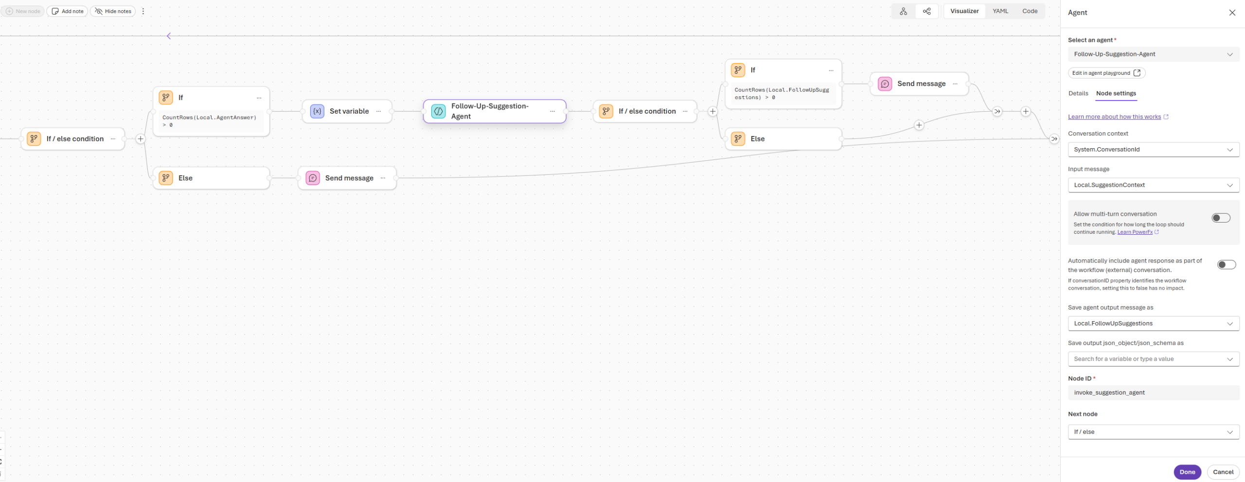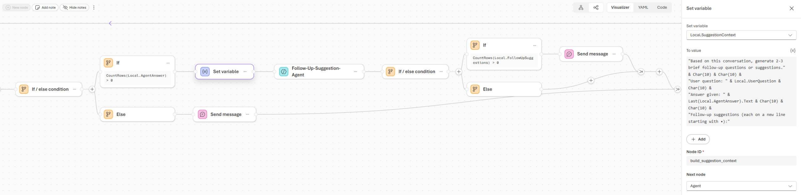 Once an answer is generated and sent to the user, we will set the variable named LocalSuggestedContext with instructions for the agent, then use it to invoke the agent that is responsible for generating meaningful suggestions: