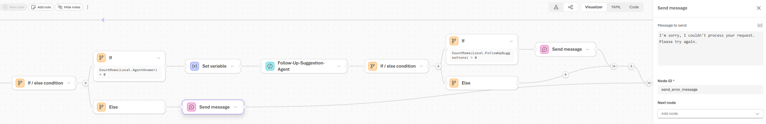 The reason for incorporating this is because agents can sometimes fail to respond due to timeouts, errors, or other reasons and by using CountRows() > 0 to determine whether suggestions were generated, we can gracefully handle failures and show a friendly error message instead of having the workflow crash or behave unpredictably. If the generation of suggestions has failed then a: “I’m sorry, I couldn’t process your request. Please try again.” is presented.
