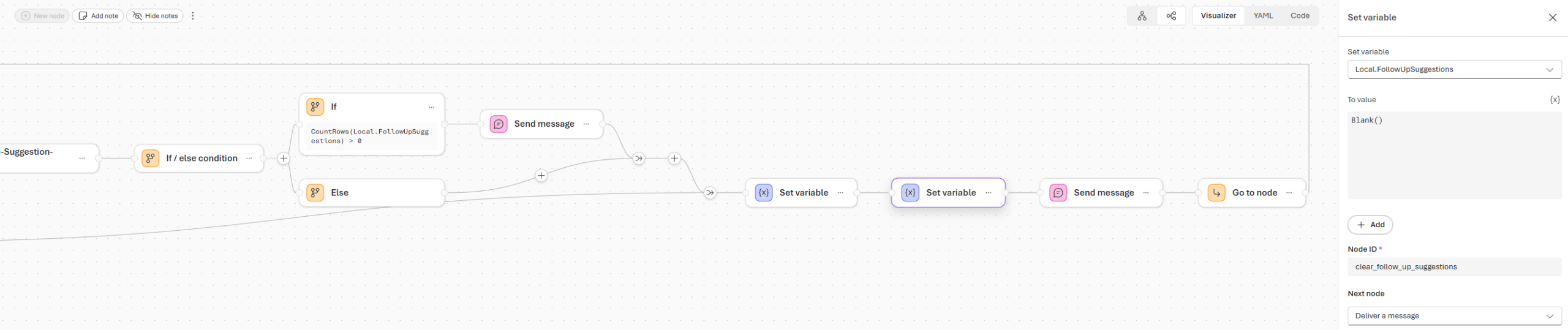 We want to ensure that the values stored in CountRows(Local.FollowUpSuggestions) is cleared for scenarios where the next run’s agent fails to generate suggestions but the previous stored data makes it look like suggestions were successfully created.