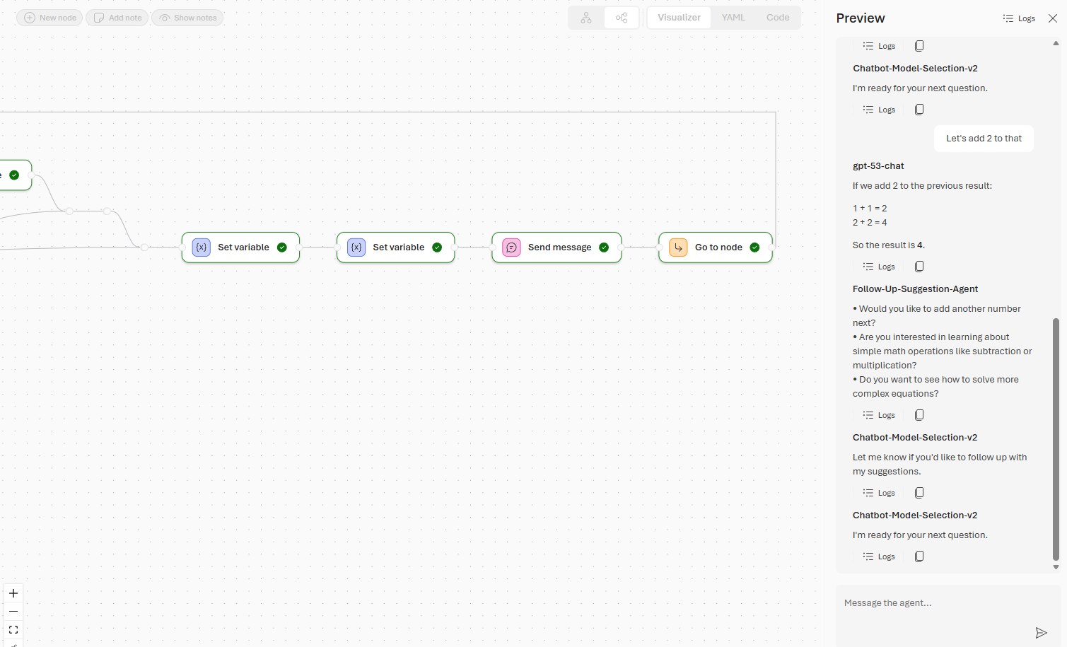 Note: The conversationId: =System.ConversationId parameter is what enables context preservation. By passing the same conversation ID to the agent on each invocation, the underlying LLM maintains the full conversation history. This is why the model will understand what to do if the first question asked is “what was 1+1?”, then a follow up with “add 2 to it”.