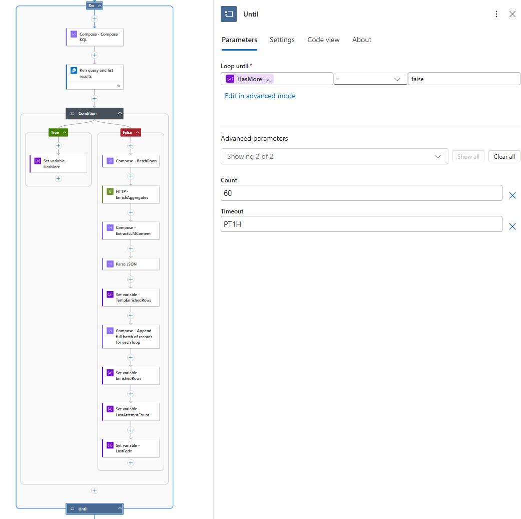 let BatchSize = @{variables('BatchSize')}; let StartTime = todatetime('@{variables('StartTimeUtc')}'); let EndTime = todatetime('@{variables('EndTimeUtc')}'); let LastCount = toint('@{variables('LastAttemptCount')}'); let LastName = '@{variables('LastFqdn')}'; let Agg = AZFWApplicationRule | where TimeGenerated >= StartTime and TimeGenerated < EndTime | where Action == "Deny" | where isnotempty(Fqdn) | summarize AttemptCount = count(), SourceIPs = make_set(SourceIp, 100), DestinationPorts = make_set(DestinationPort, 100) by Fqdn; Agg | where (AttemptCount < LastCount) or (AttemptCount == LastCount and strcmp(Fqdn, LastName) > 0) | sort by AttemptCount desc, Fqdn asc | take BatchSize | project Fqdn, AttemptCount, SourceIPs, DestinationPorts
