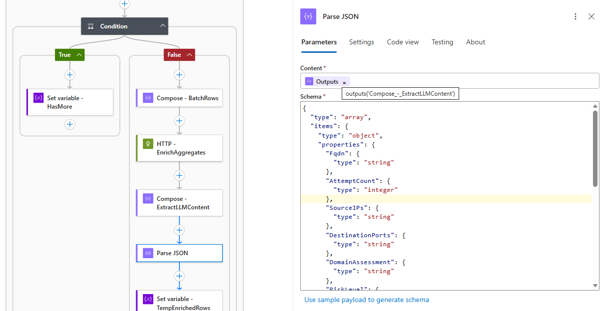 - Send the batch to GPT-4o for enrichment: https://github.com/terenceluk/Azure/blob/main/Logic%20App/Batch-Processing-Firewall-Logs-with-AI/Query-AI-LLM.json