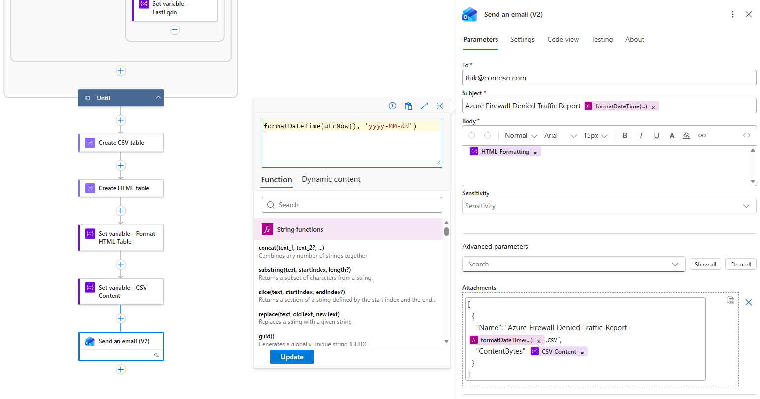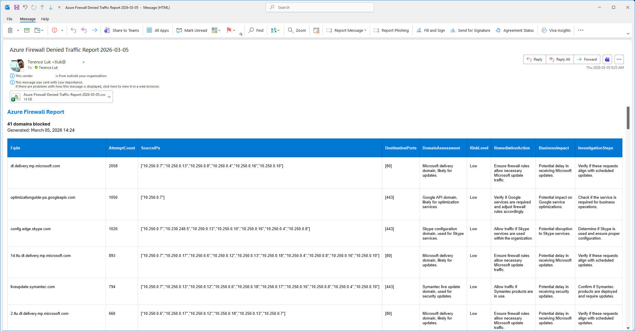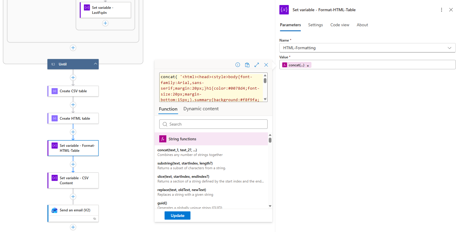 concat( ‘<html><head><style>body{font-family:Arial,sans-serif;margin:20px;}h1{color:#0078d4;font-size:20px;margin-bottom:15px;}.summary{background:#f8f9fa;padding:12px;margin:15px 0;border-left:4px solid #0078d4;border-radius:0 4px 4px 0;}table{width:100%;border-collapse:collapse;margin:15px 0;font-size:13px;}th{background:#0078d4;color:white;padding:8px 10px;border:1px solid #005a9e;text-align:left;font-weight:600;}td{padding:6px 10px;border:1px solid #e0e0e0;vertical-align:top;}tr:nth-child(even){background:#f9f9f9;}tr:hover{background:#f0f7ff;}.risk-low{background:#d4edda;color:#155724;padding:2px 8px;border-radius:10px;font-size:11px;font-weight:600;display:inline-block;}.risk-medium{background:#fff3cd;color:#856404;padding:2px 8px;border-radius:10px;font-size:11px;font-weight:600;display:inline-block;}.risk-high{background:#f8d7da;color:#721c24;padding:2px 8px;border-radius:10px;font-size:11px;font-weight:600;display:inline-block;}</style></head><body><h1>Azure Firewall Report</h1><div class=“summary”><p><strong>’, length(variables(‘EnrichedRows’)), ‘ domains blocked</strong><br>Generated: ‘, formatDateTime(utcNow(), ‘MMMM dd, yyyy HH:mm’), ‘</p></div>’, replace(replace(replace(body(‘Create_HTML_table’), ‘>Low<‘, ‘><span class=“risk-low”>Low</span><‘), ‘>Medium<‘, ‘><span class=“risk-medium”>Medium</span><‘), ‘>High<‘, ‘><span class=“risk-high”>High</span><‘), ‘</body></html>’ )